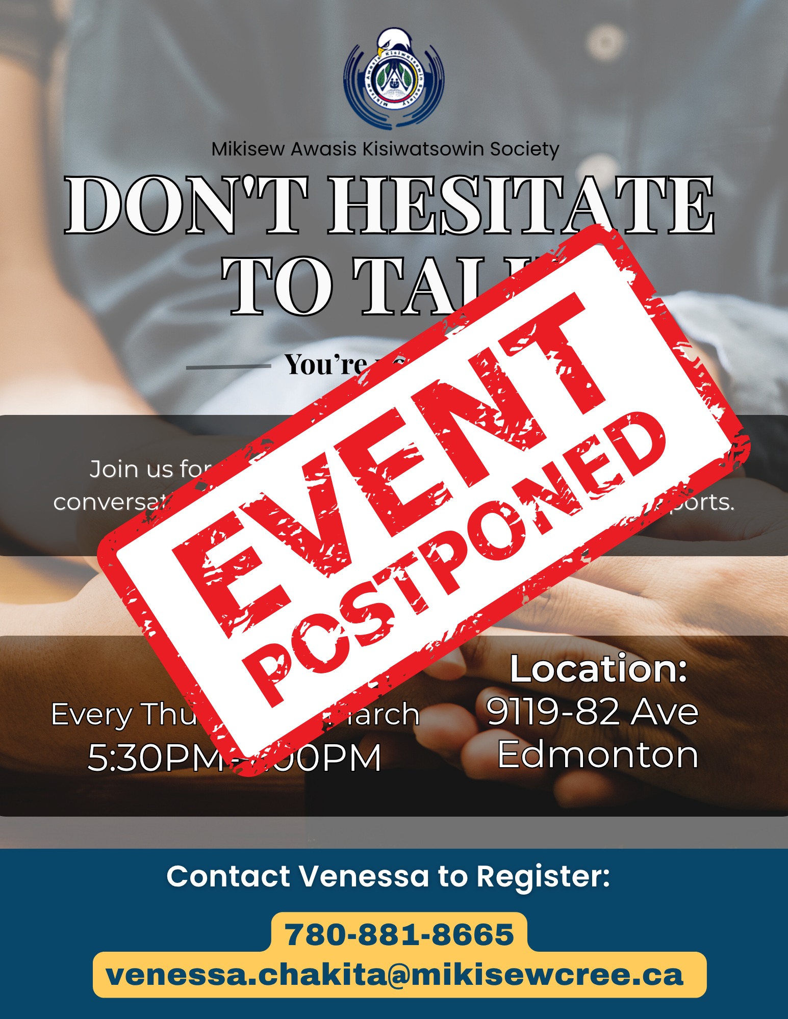 Mikisew Awasis Kisiwatsowin Society: Don’t Hesitate To Talk + Add to Google Calendar + iCal / Outlook export 00 days 00 hours 00 minutes 00 seconds Date Apr 16 2026 Time 5:30 pm - 7:00 pm Location Edmonton Sub-office 9119- 82nd avenue Share this event